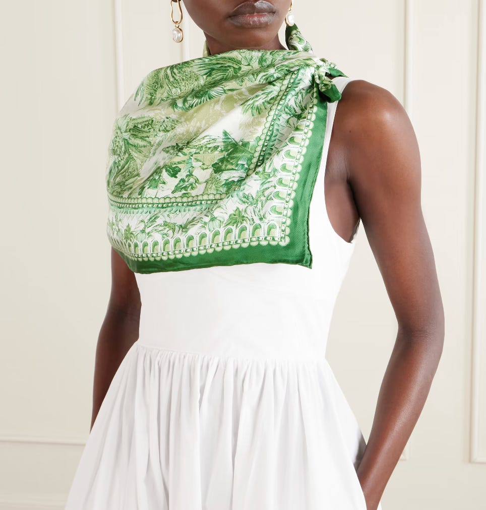 Have you noticed how scarves are everywhere right now? This green is SO beautiful and made from silk. It has the versatility of a sarong but you can wear it around your neck, as a bandeau top, tie it to a bag, carry your child in it . . you get the picture.